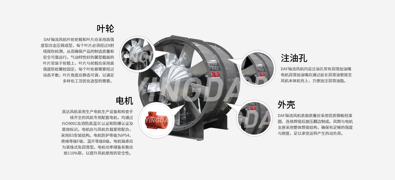 英達(dá)風(fēng)機采用生產(chǎn)電機生產(chǎn)設(shè)備和檢查手續(xù)齊全的風(fēng)機專用配套電機,均通過ISO9001及消防高溫3C認(rèn)證和防爆認(rèn)證及能效標(biāo)識。電機應(yīng)與風(fēng)機負(fù)載緊密配合,采用B3安裝結(jié)構(gòu)。電機防護(hù)等級為IP54,絕緣等級F級,溫升等級B級。電機軸承應(yīng)為滾珠式免潤滑型。電機功率儲備系數(shù)應(yīng)按110%取,以提升風(fēng)機使用的安全性。