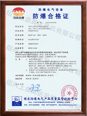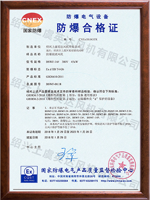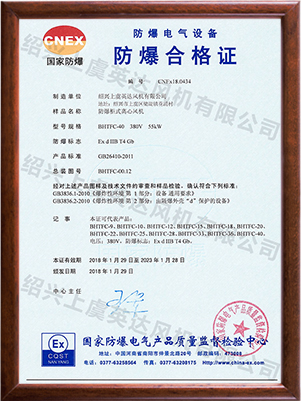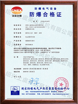 為適應(yīng)防爆環(huán)境需要,風(fēng)機(jī)可做成防爆風(fēng)機(jī),防爆等級(jí)為EXdⅡBT4,適用于易燃、易爆氣體的場所。整機(jī)通過國家防爆認(rèn)證。