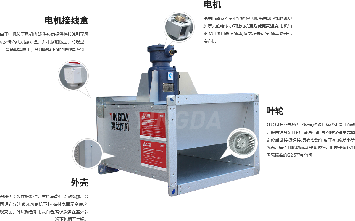 由于電機(jī)位于風(fēng)機(jī)內(nèi)部,供應(yīng)商應(yīng)提供將接線引至風(fēng)機(jī)外部的電機(jī)接線盒,并根據(jù)消防型、防爆型、普通型等應(yīng)用,分別配備正確的接線盒類型。